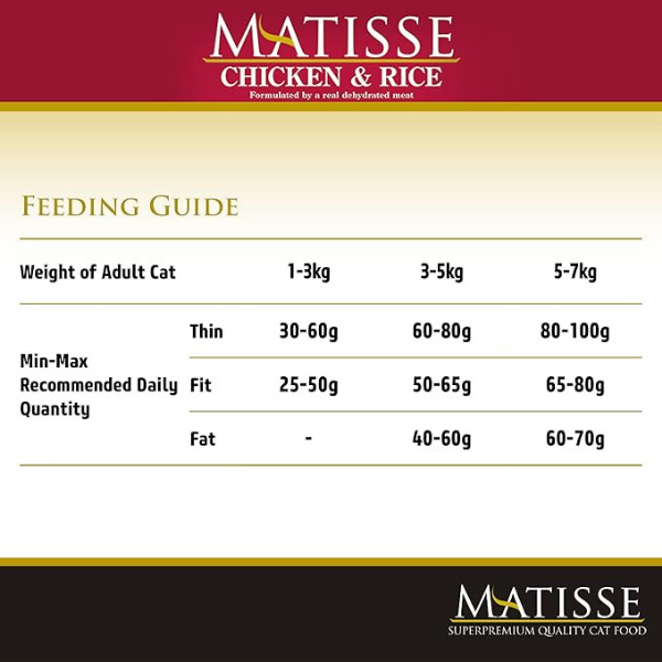 crude protein 32.00%; crude fat 11.00%; crude fibres 1.20%; crude ash 6.60%; Calcium 1.00%; Phosphorus 0.90%; Magnesium 0.08%; Taurine 1800mg/kg. Instructions for use: Serve the product as it is, following the daily quantity indicated in the table. It is recommended to mix initially Matisse with the diet previously used. Please ensure your cat has access to clean, fresh water at all times. Store in a cool, dry place and in closed package. Produced 18 months before the best‐before date printed on the pack. Net weight, best before date, batch code, factory registration number: see back of pack. 100% Guaranteed.