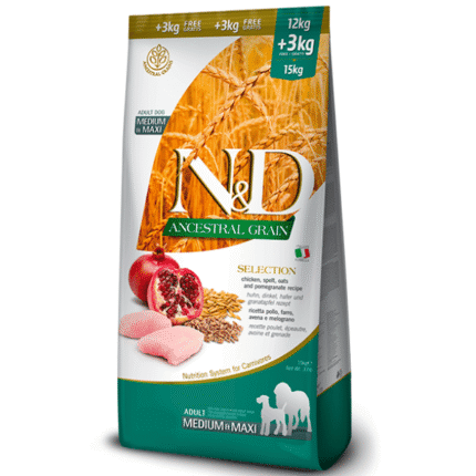 ₹891.00 – ₹2,385.00Price range: ₹891.00 through ₹2,385.00FARMINA PET FOODS Ancestral Grain Selection Dry Dog Food, Adult Medium & Maxi Breed, 12kg + 3kg Free, Chicken and Pomegranate