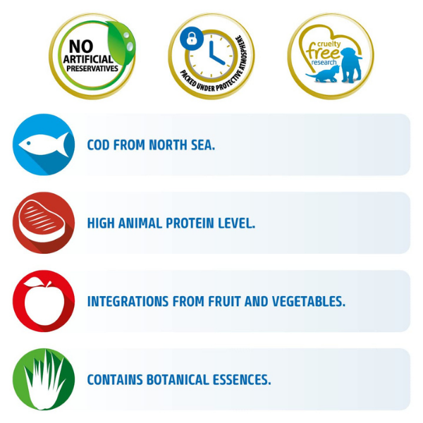 Cod (28%), dehydrated cod protein (27%), sweet potato, fish oil (from herring), dehydrated herring protein, dried pumpkin (5%), dehydrated shrimp (source of glucosamine and chondroitin sulphate), pea fibre, dried carrot, alfalfa meal, inulin, fructo-oligosaccharides, yeast extract (source of manno-oligo-saccharides), dried cantaloupe melon (0.5%), dried apple, dried pomegranate, dried spinach, psyllium husks and seeds, dried blueberry, sodium chloride, potassium chloride, calcium carbonate, dried brewers’ yeast, turmeric (0.2%), aloe vera extract.