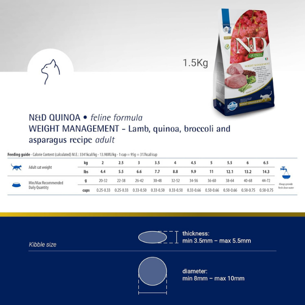 Farmina N&D Quinoa Weight Management Cat Food | Grain-Free | Lamb, Quinoa, Broccoli & Asparagus | Supports Healthy Weight | for Adult Cats